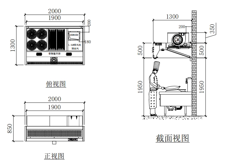 1.一体烟罩集前补新风或风幕、LED 照明、净化、排风、智能升降于一体。且具备耐温、耐酸碱、阻燃、耐磨、耐拉等功能。有良好的防火性能和良好的机械强度。